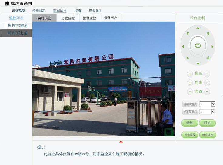2.可以查看揚(yáng)塵檢測點(diǎn)位配套的實(shí)時(shí)監(jiān)控和歷史監(jiān)測。