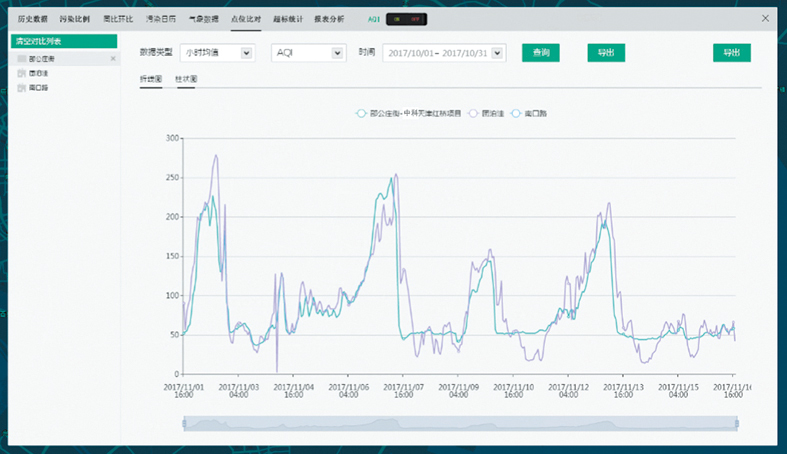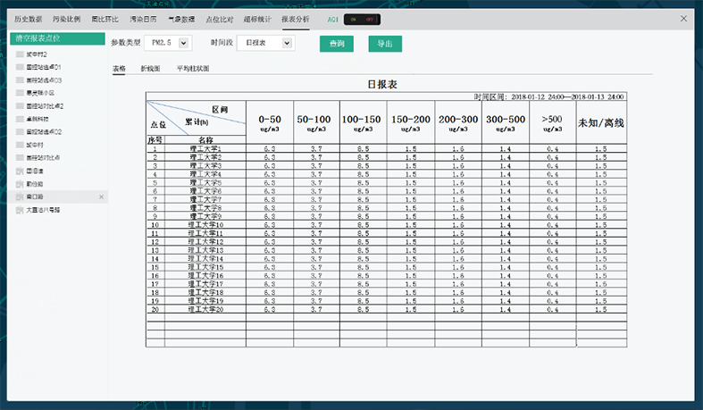 可以對特定的點(diǎn)位按選定的時(shí)間段進(jìn)行超標(biāo)統(tǒng)計(jì),以表和圖兩種方式同時(shí)顯示。通過圖可以直觀地看到超標(biāo)的情況,通過表可以詳細(xì)查看什么時(shí)間出現(xiàn)的超標(biāo)。