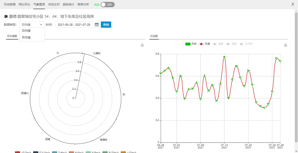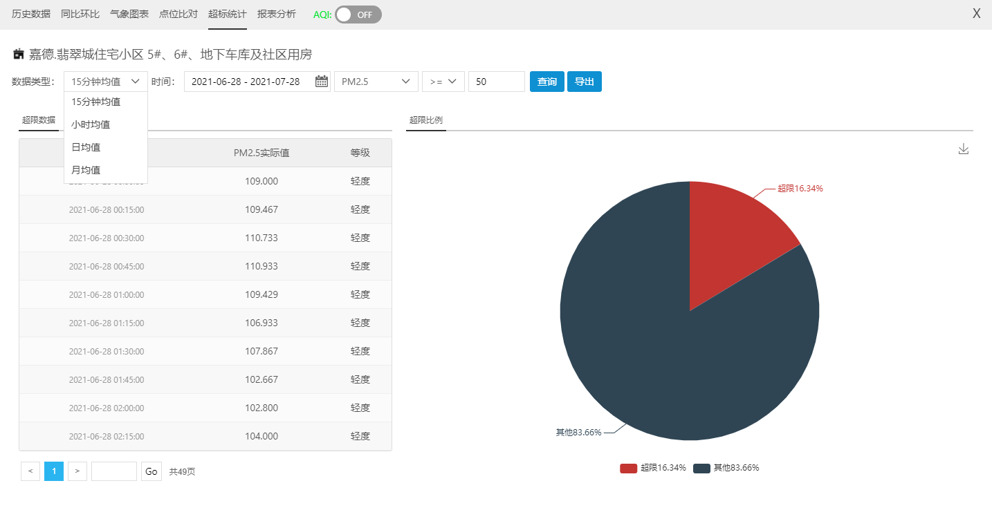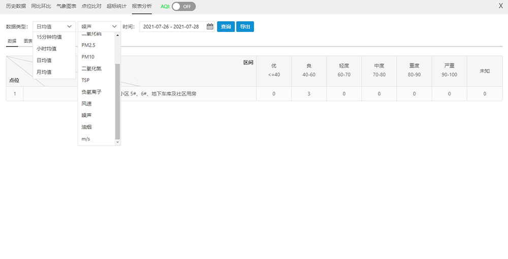 對特定點位選定時間段進行超標(biāo)統(tǒng)計,以表和圖兩種方式同時顯示,通過圖可以直觀看到超標(biāo)的情況,通過表可以詳細看到具體超標(biāo)時間