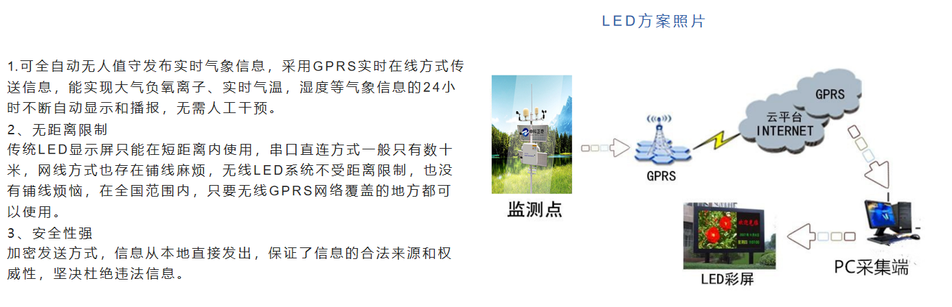 可對負氧離子、溫濕度進行監(jiān)測, 并可根據(jù)客戶需求增加P M 2 . 5 、 P M 1 0 、噪聲、臭氧、二氧化氮、二氧化硫、一氧化碳、風(fēng)速、風(fēng)向 等等監(jiān)測項目, 充分滿足環(huán)保局、旅游局對環(huán)境監(jiān)測需要。