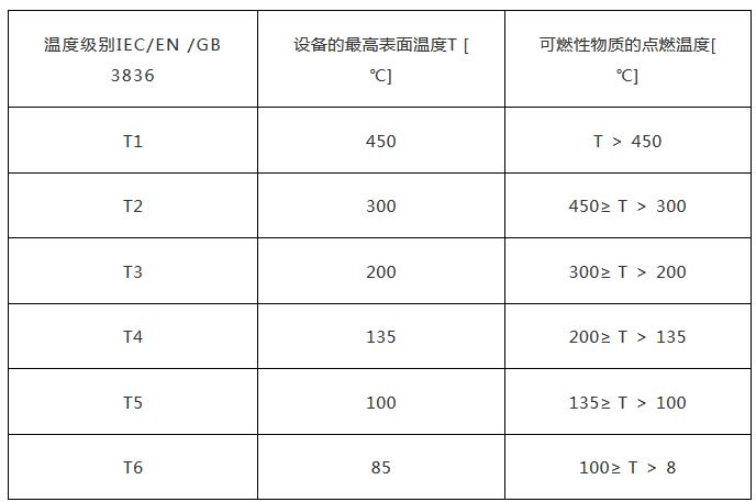 電氣設(shè)備按其最高表面溫度分為 T1 ~ T6 組,使得對應(yīng)的 T1 ~ T6 組的電氣設(shè)備的最高表面溫度不能超過對應(yīng)的溫度組別的允許值。溫度組別、設(shè)備表面溫度和可燃性氣體或蒸汽的引燃溫度之間的關(guān)系如下表所示: