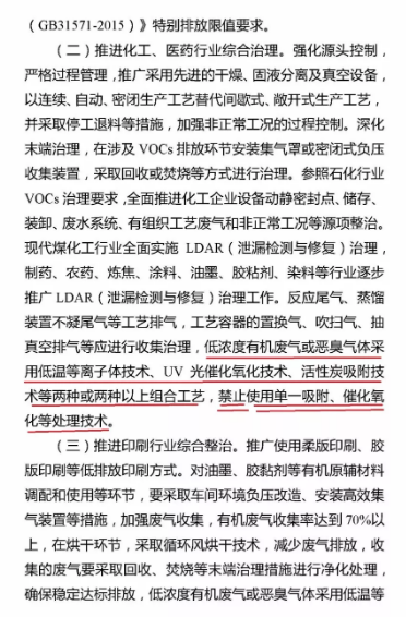 2)又如,2018年11月1日,長沙市環(huán)保局發(fā)布“關(guān)于印發(fā)《長沙市包裝印刷行業(yè)揮發(fā)性有機(jī)物整治規(guī)范》”,指出“廢氣處理采用用高效治理措施,不宜采用單一活性炭吸附工藝”、“在污染總量規(guī)模不大且濃度低、周邊環(huán)境不明剛的前提下,采用UV光催化法與吸收技術(shù)配套聯(lián)合處理”