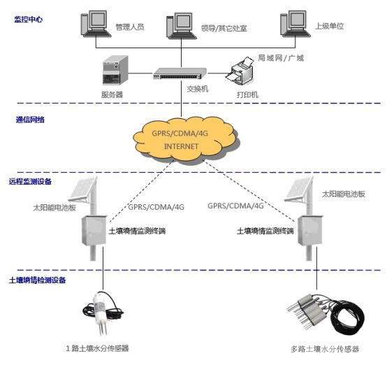 土壤墑情監(jiān)測系統(tǒng)主要由監(jiān)控中心、通信網絡、遠程監(jiān)測設備和土壤墑情檢測設備四部分構成。
