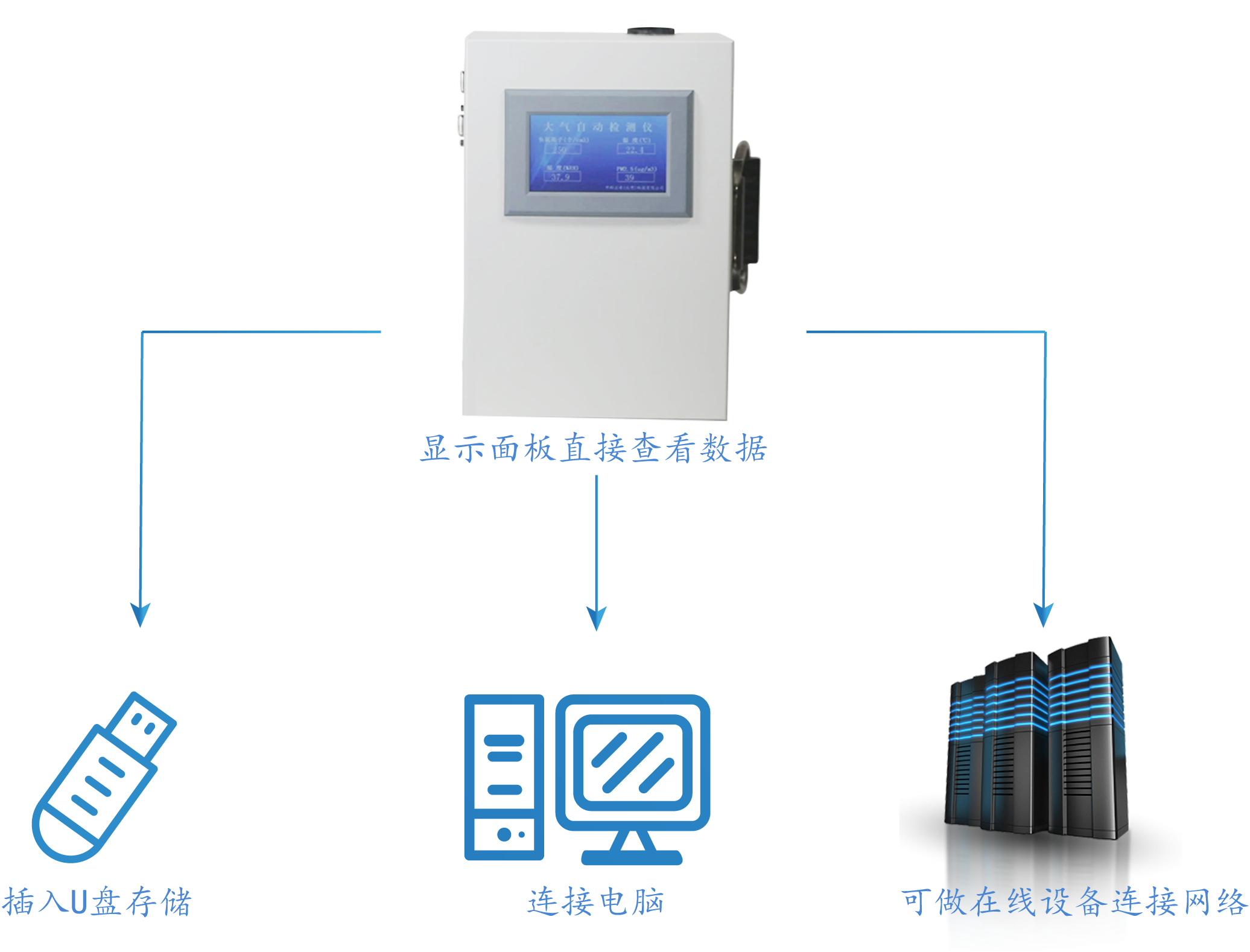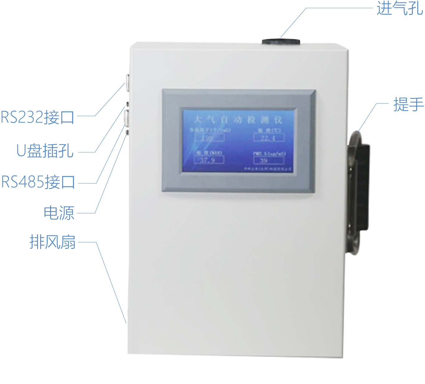 本設備根據便攜式和在線一體化的思想設計。采用高精度傳感器和金屬箱體,能實時測量負氧離子、PM2.5、溫度、濕度。本設備可支持長期在線使用也可臨時測量。即可當在線設備使用,也可以當做便攜式使用。