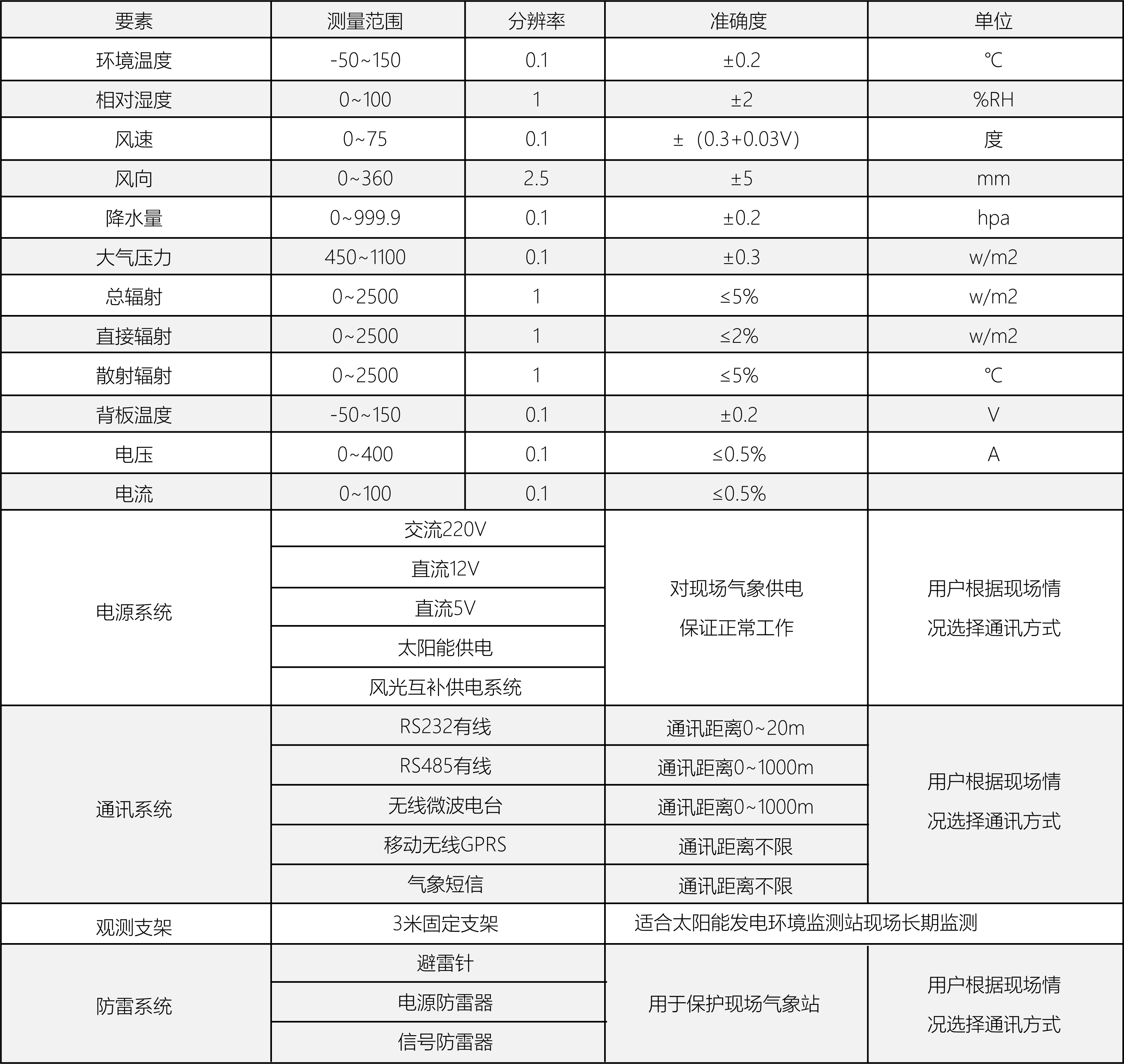 ZK-GF10A光伏氣象站太陽能發(fā)電環(huán)境監(jiān)測站是按照國際氣象WMO組織氣象觀測標(biāo)準(zhǔn)和IEC(國際電工技術(shù)委員會)規(guī)范標(biāo)準(zhǔn)設(shè)計(jì)、生產(chǎn)的標(biāo)準(zhǔn)環(huán)境監(jiān)測站,同時也符合《并網(wǎng)光伏發(fā)電系統(tǒng)工程驗(yàn)收技術(shù)規(guī)范》要求。本自動站可觀測的氣象要素有:環(huán)境溫度、環(huán)境濕度、露點(diǎn)溫度、風(fēng)速、風(fēng)向、氣壓、太陽總輻射等多項(xiàng)指標(biāo)。具有性能穩(wěn)定,檢測精度高,無人值守等特點(diǎn),可滿足專業(yè)氣象觀測的業(yè)務(wù)要求。